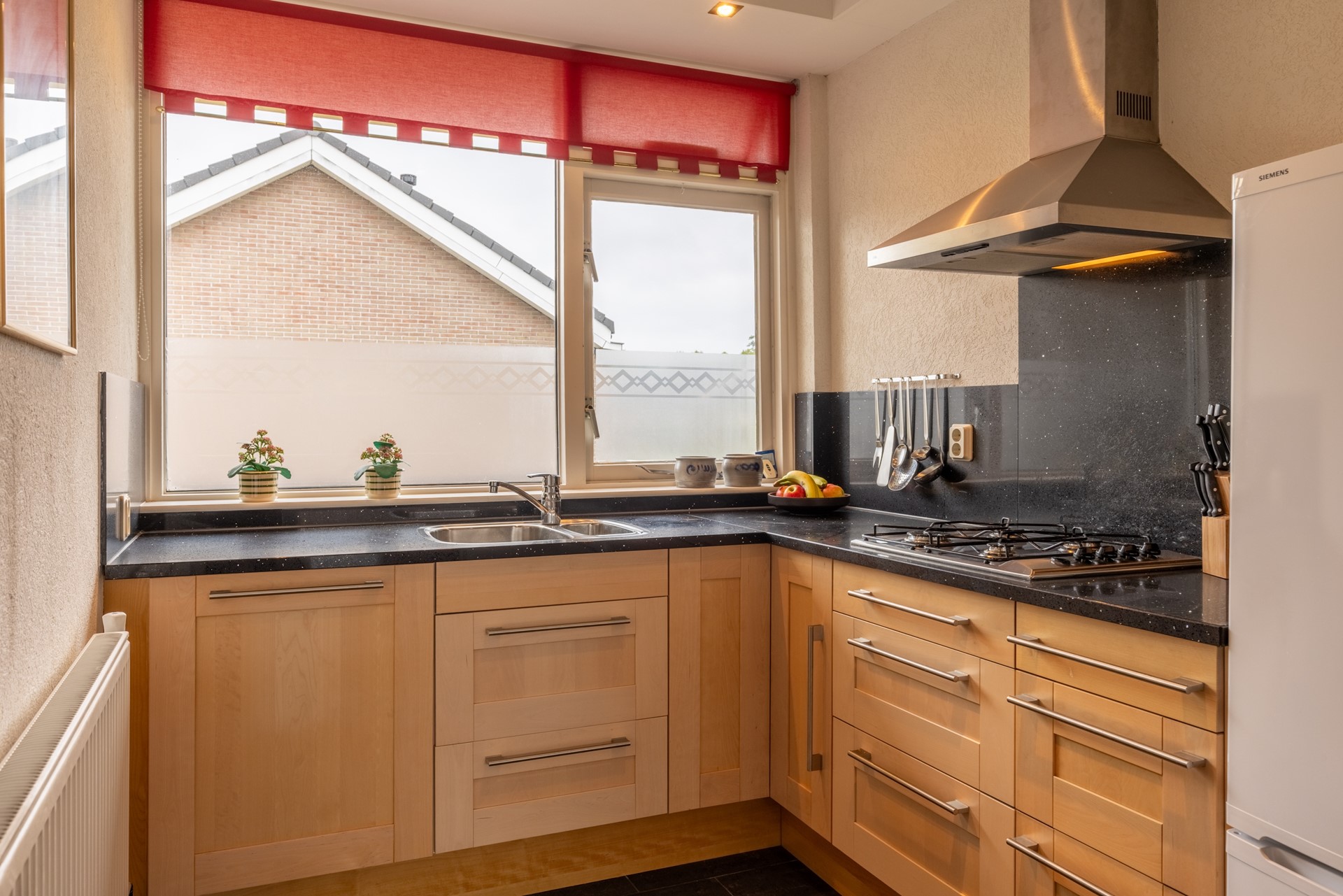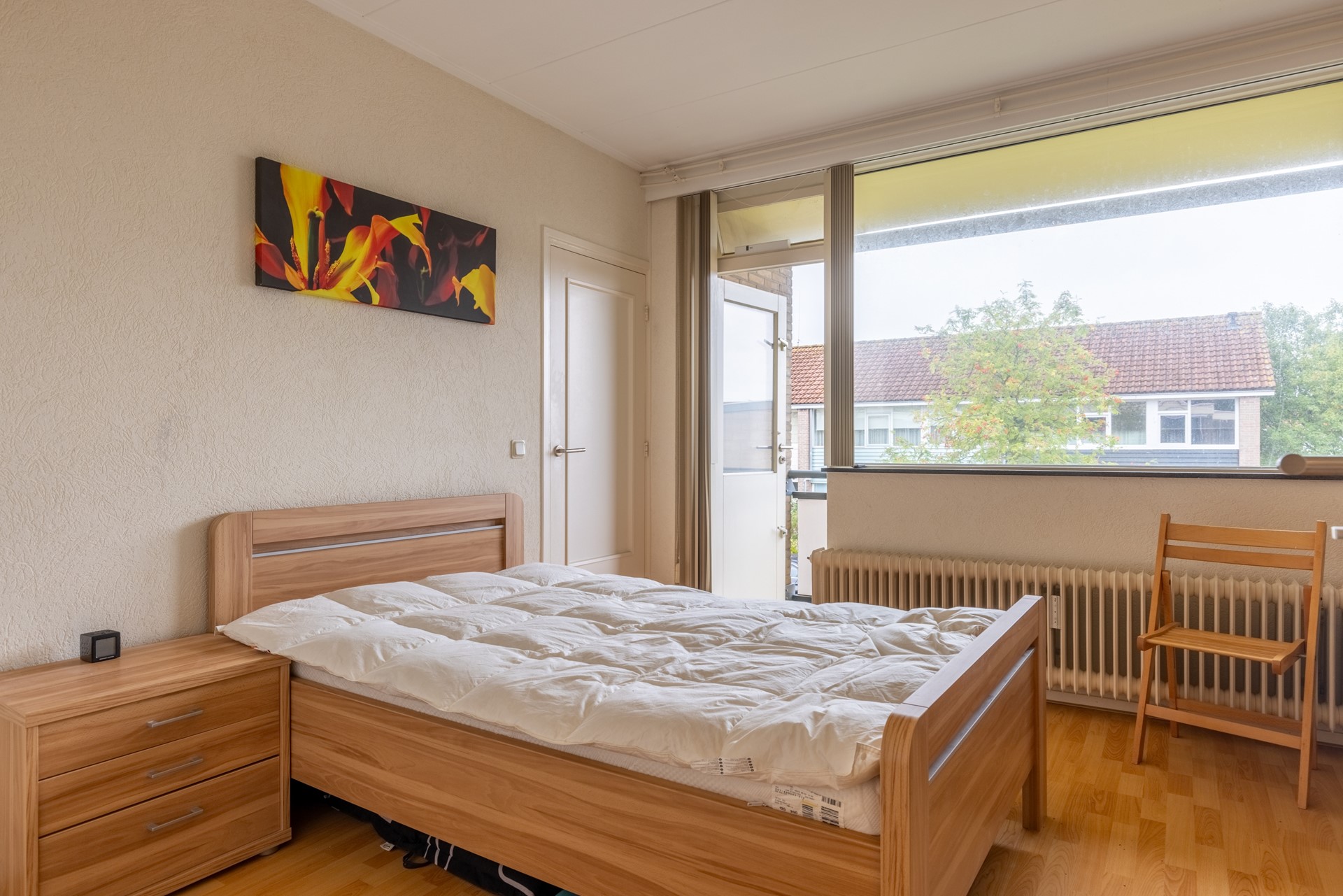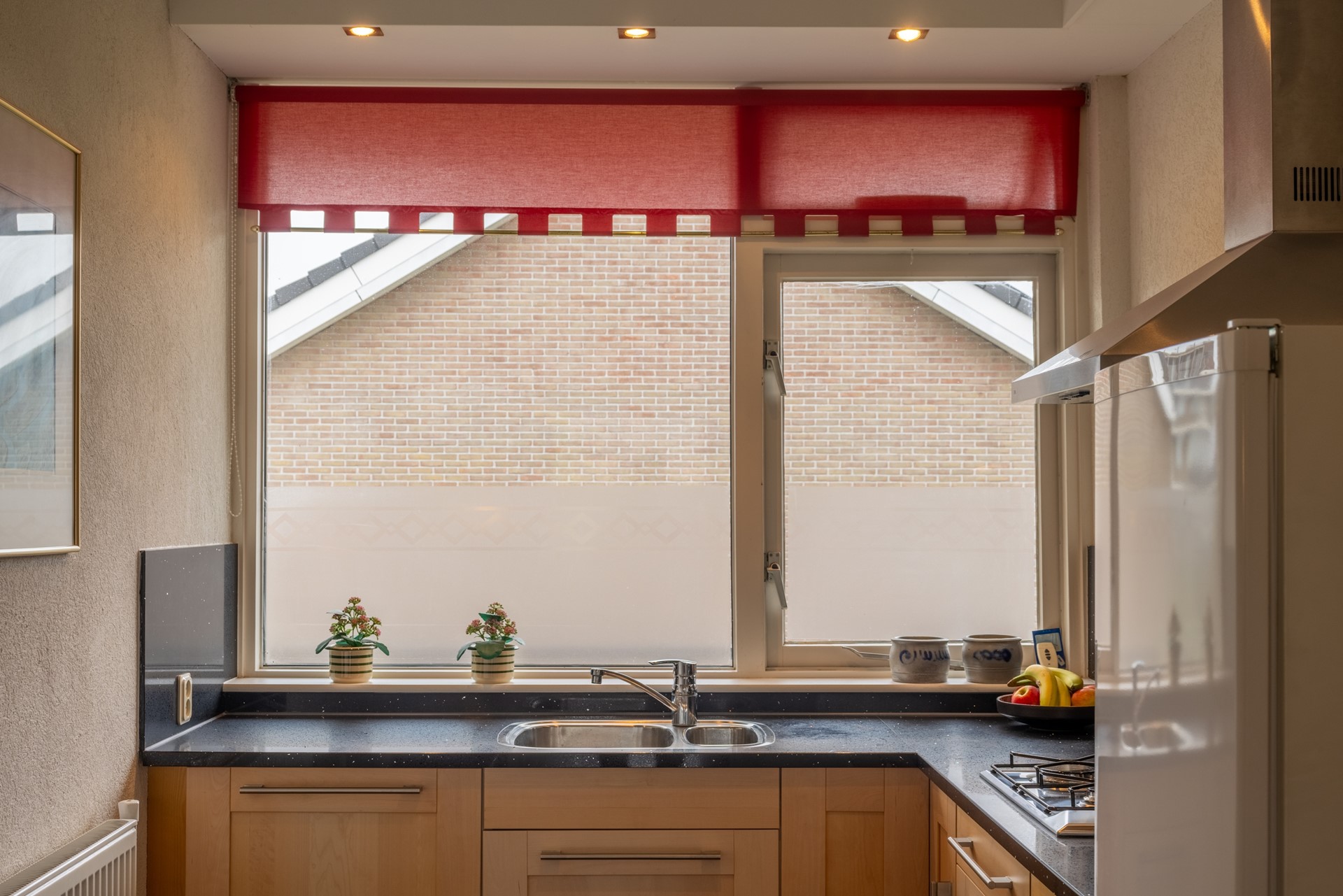 1e etage: hal, entree, meterkast, slaapkamer in gebruik als kantoorruimte, lichte ruime woonkamer, 2e slaapkamer met balkon en doorloop naar de badkamer en separate toiletruimte met wandcloset en fonteintje, moderne hoekkeuken met inbouwapparatuur, o.a. een 4- pits gaskookplaat en een afzuigkap, losse koelkast en vaatwasser. Bijkeuken met keukenblok is voorzien van de wasmachine- en CV-ketel aansluitingen. Gemeenschappelijke buitenberging.