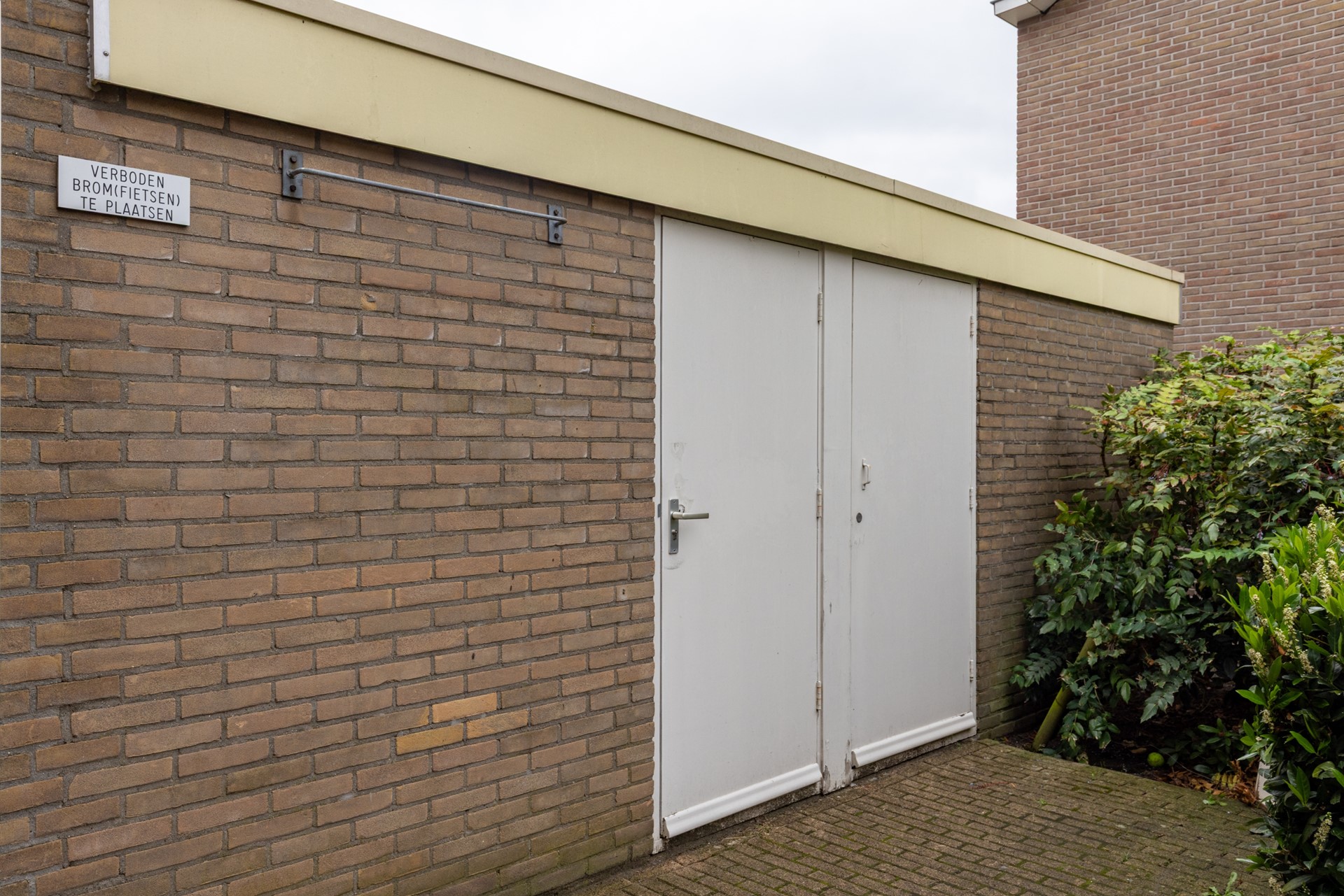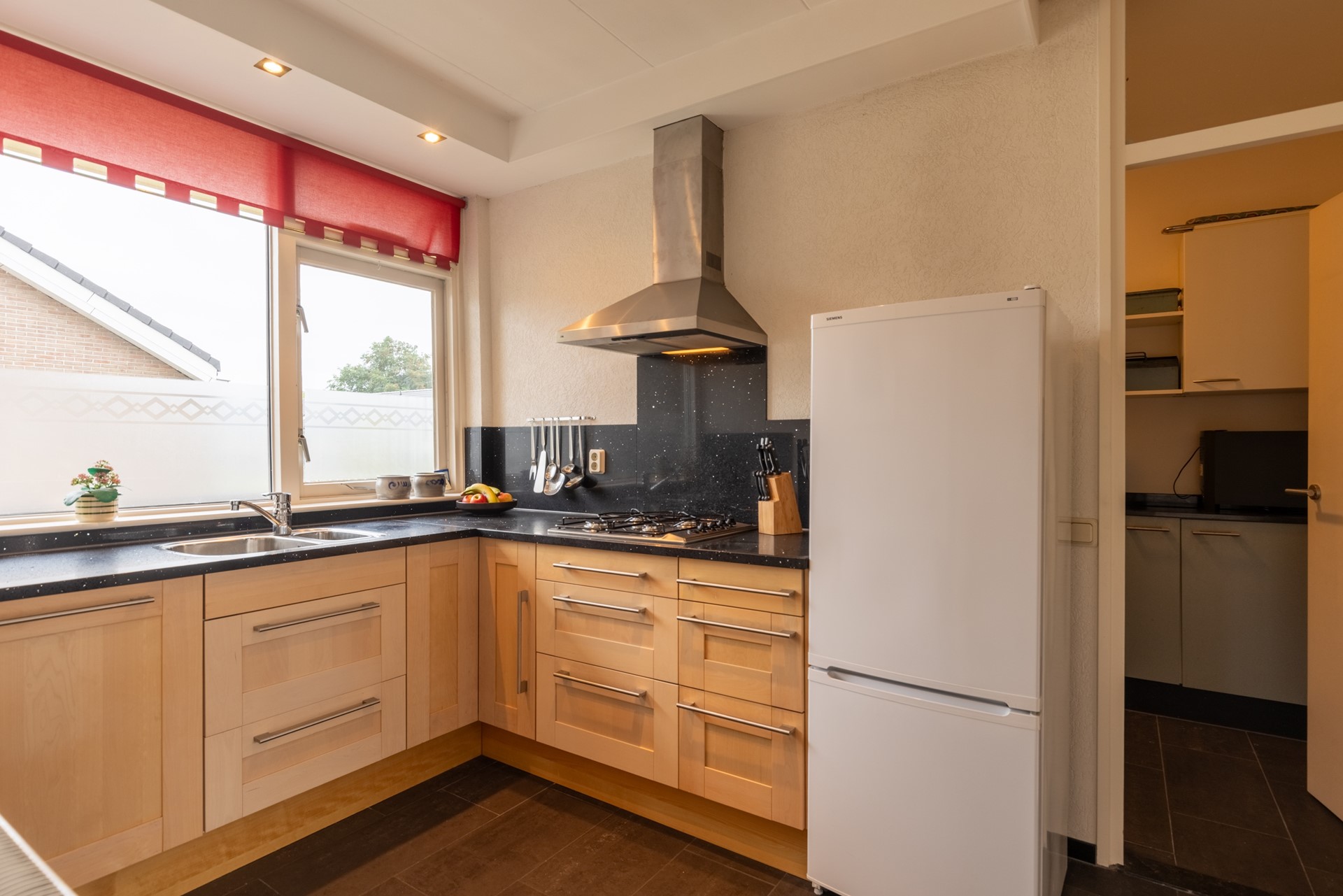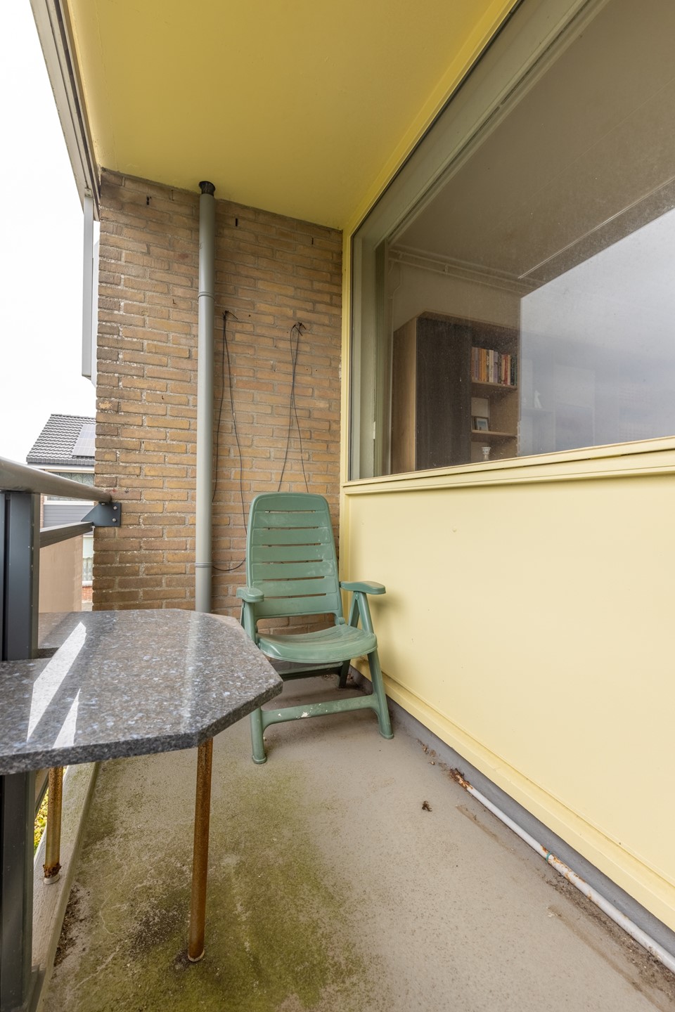 1e etage: hal, entree, meterkast, slaapkamer in gebruik als kantoorruimte, lichte ruime woonkamer, 2e slaapkamer met balkon en doorloop naar de badkamer en separate toiletruimte met wandcloset en fonteintje, moderne hoekkeuken met inbouwapparatuur, o.a. een 4- pits gaskookplaat en een afzuigkap, losse koelkast en vaatwasser. Bijkeuken met keukenblok is voorzien van de wasmachine- en CV-ketel aansluitingen. Gemeenschappelijke buitenberging.