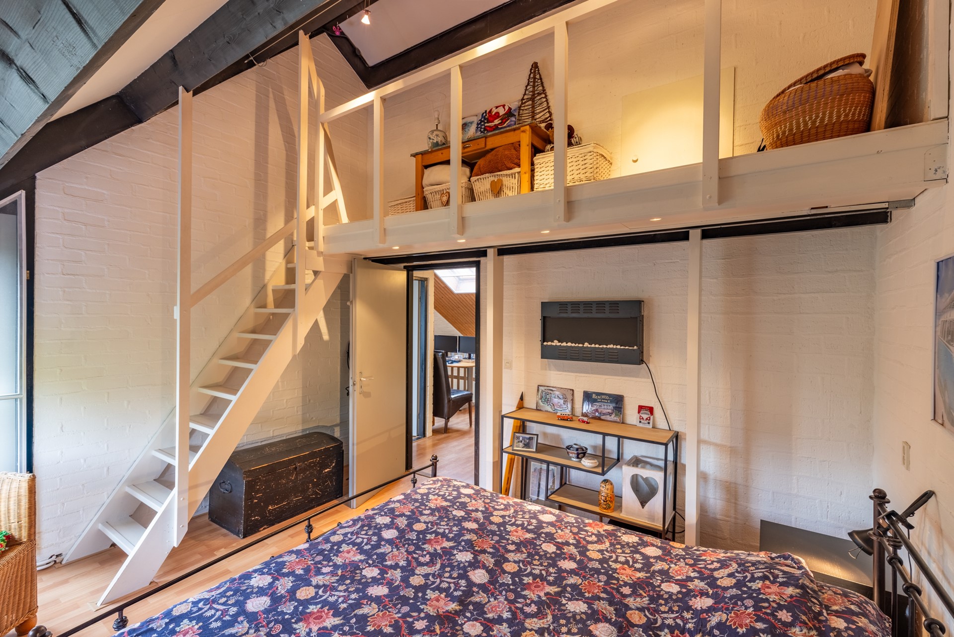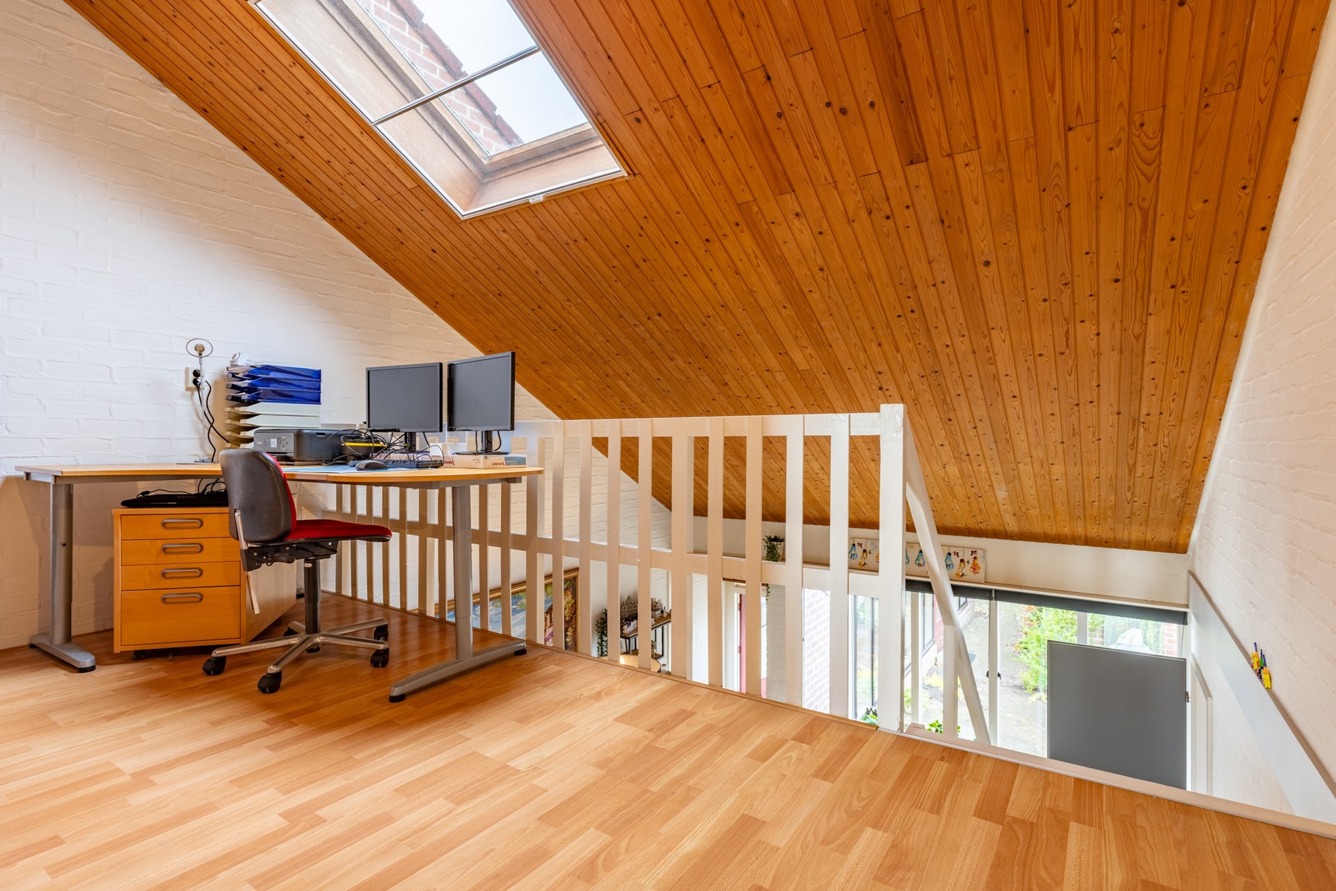 Overloop met vide, 3 slaapkamers. Op 1 slaapkamer is er een trap naar de zolder, badkamer met dubbele wastafel en 2e wandcloset