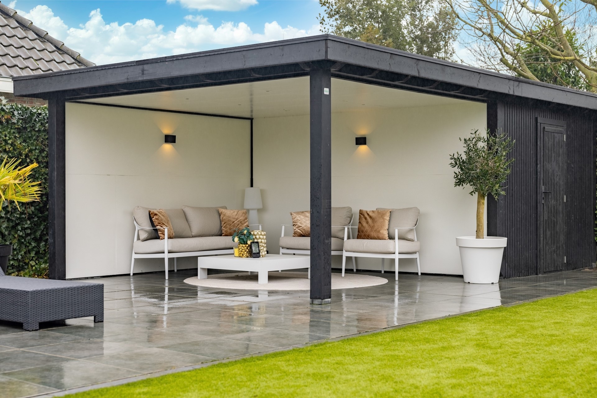 • vrijstaande houten berging en overkapping achterin de tuin (2022)